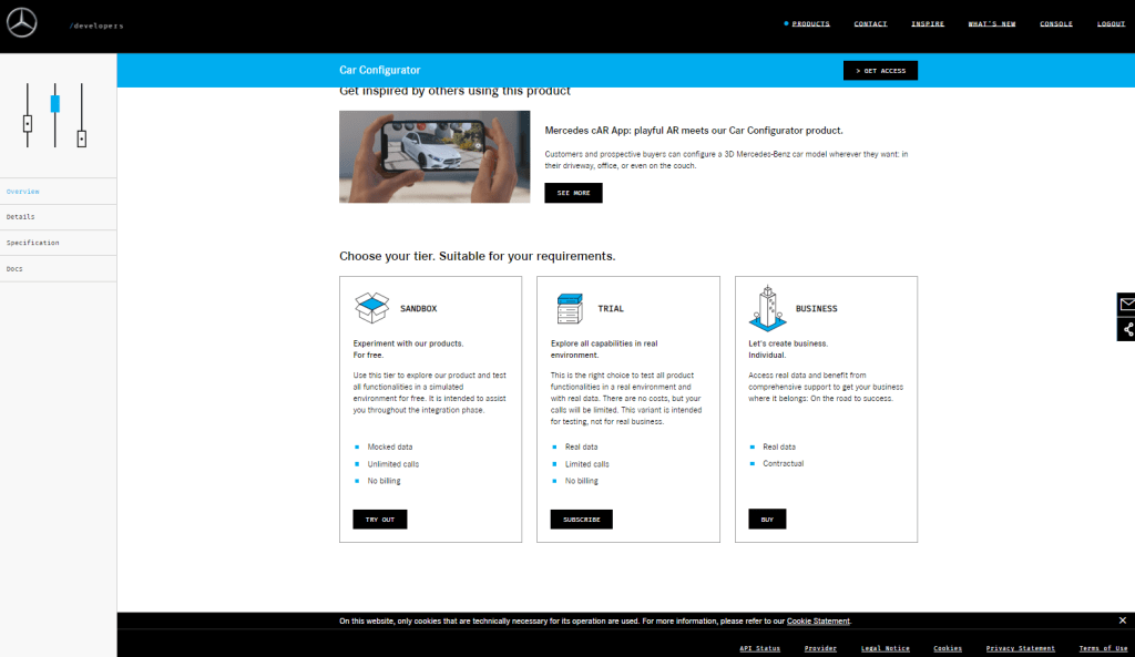 Looking at the APIs around the car (requires registration). The documentation is rich in content, providing information not only about the API but likely use cases. With this, they’ve provided information about how to access, what is provided for different tiers of use. Although exact charges are not listed (presumably until you register a project with Mercedes).