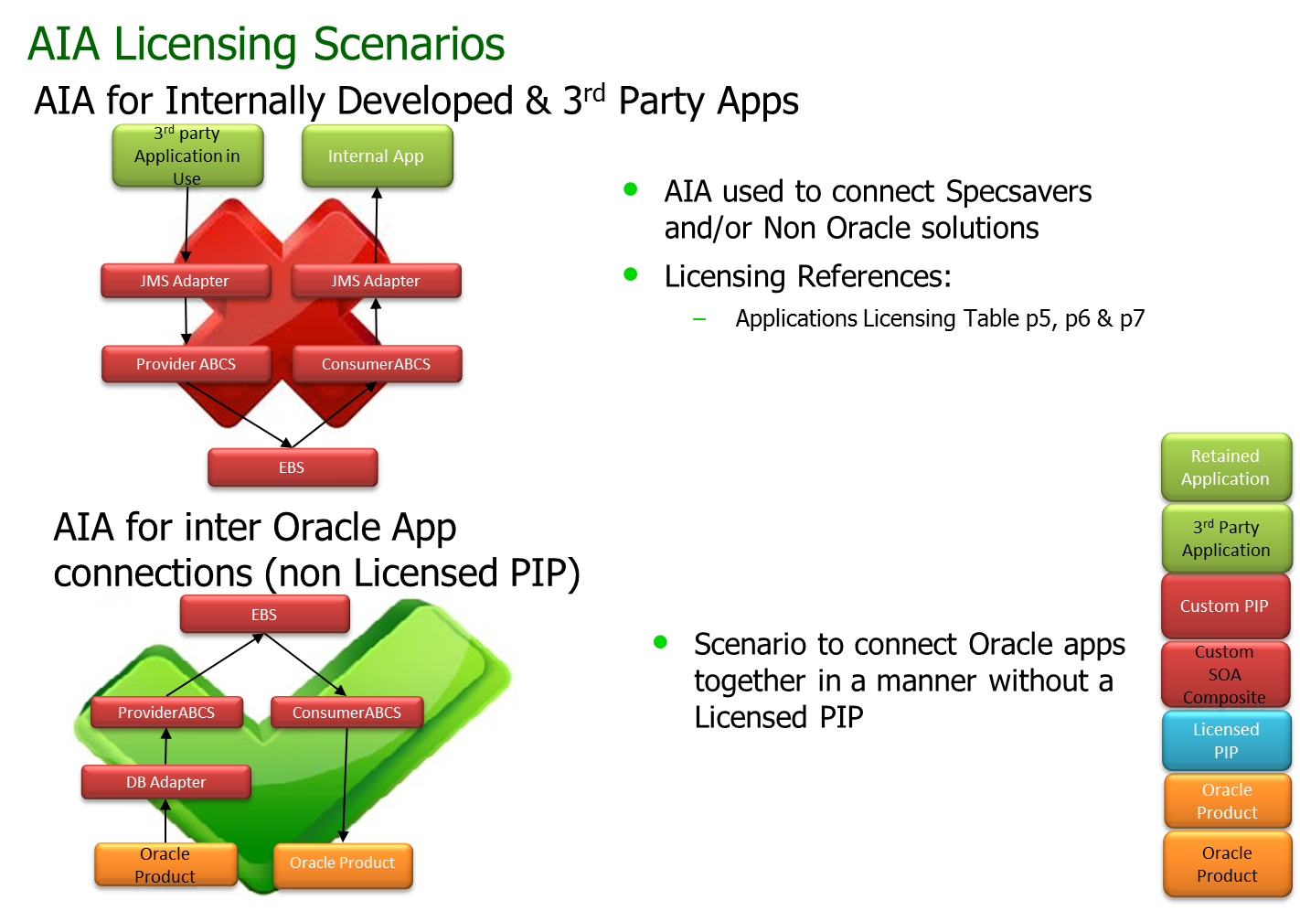 So how does it work, so we have identified common or likely approaches to using our Oracle technology stack, need them so there is a short hand reference (as you have with design patterns) and then determined of the scenario is permissible by licensing rules. The idea is that an application architect or developer can design a solution and then verify the solution against the scenarios. To start with go for the obvious scenarios, as things go forward when a situation crops up where there isn’t a scenario you can add the the catalogue and get confirmation as to compliance. This should mean after a short period of development you’ll reach a point where you’re not consulting licensing experts all the time. The secret is not to try ‘boil the ocean’ on day 1 as you’ll invest a lot of time, potentially creating representations of things you’ll never do and produce a very bulky artefact for your developers to try and work with. Oracle’s AIA Developer Guide
