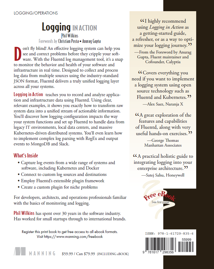 I hadn’t noticed until today, but the partner book Logging in Action, which covers Fluentd, is available in ebook and print as well as audio and video editions. As you can see, these are available on Manning and platforms like O’Reilly/Safari…
